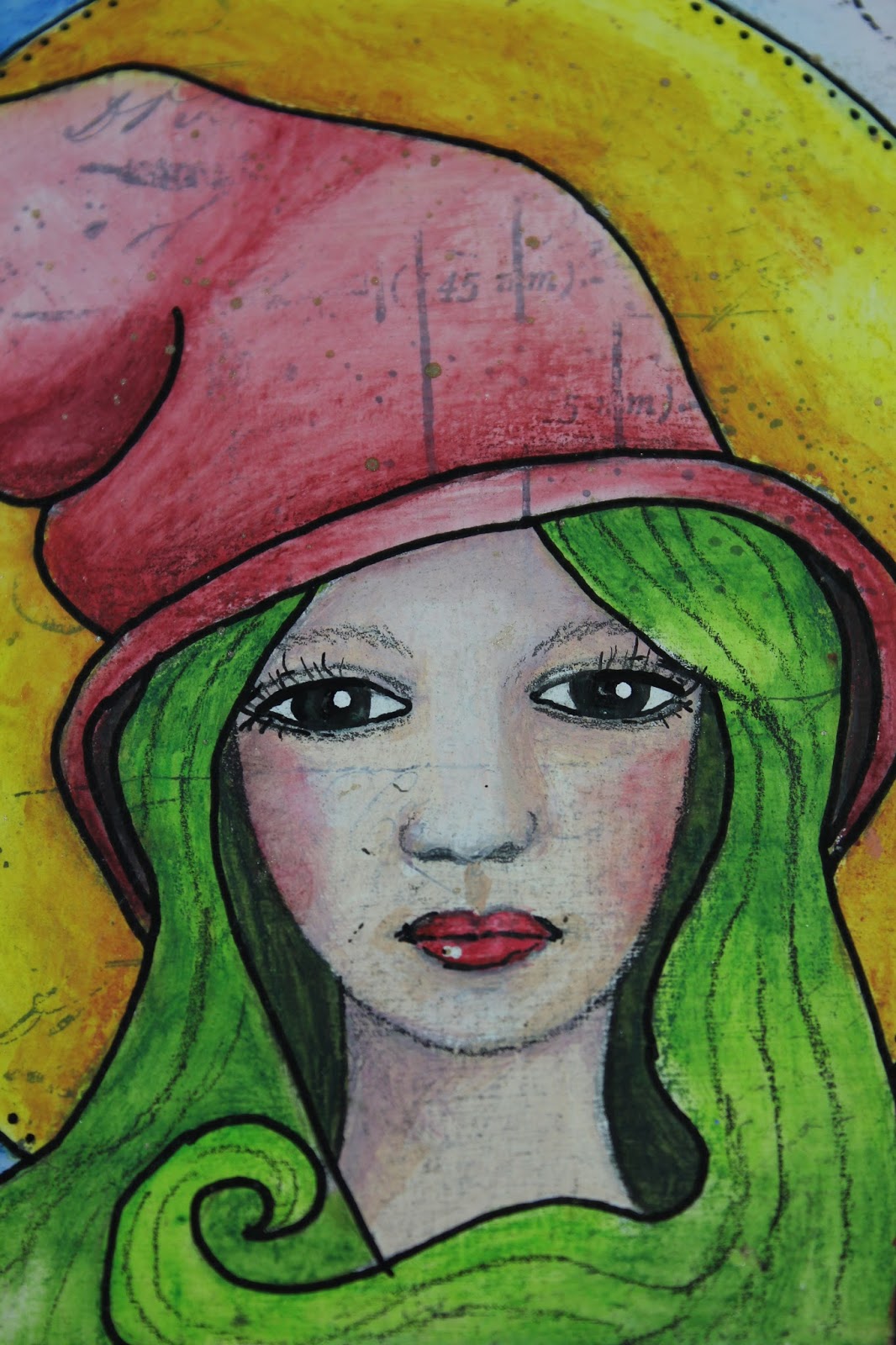 I painted the face with acrylic paint and drew with the Stabilo All pencil, just like she does. I must admit that I drew the face with a regular pencil first and used the Stabilo afterwards, because I am having trouble with the black smudges this pencil gives when it touches fluids. Dina doesn't mind, and I must admit that on her faces it seems to fit, but it just doesn't fit my style. I do like the sketchy effect though that it gives as opposed to working with a marker.